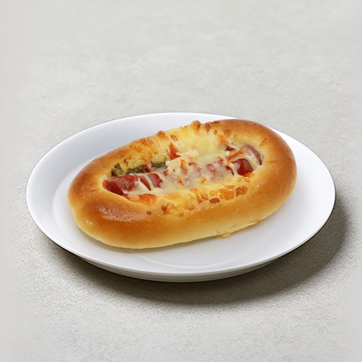 Fluffy pizza bread topped with tomato sauce, onion, melted cheese and chicken salami slices.