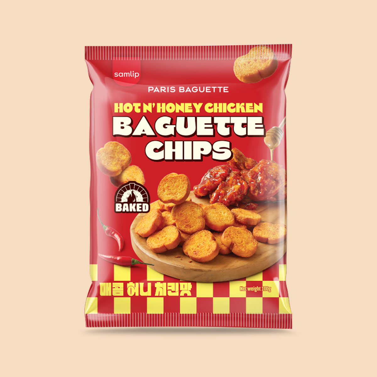 Baguette chips seasoned with a spicy-sweet honey glaze and chicken flavour.